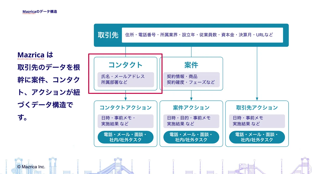 ⚫︎Mazricaの基本項目は、項目名の変更や削除、並び替えは仕様上できません(名前、メールアドレス、取引先名、部署、役職、携帯電話番号、電話番号、住所、メモ)